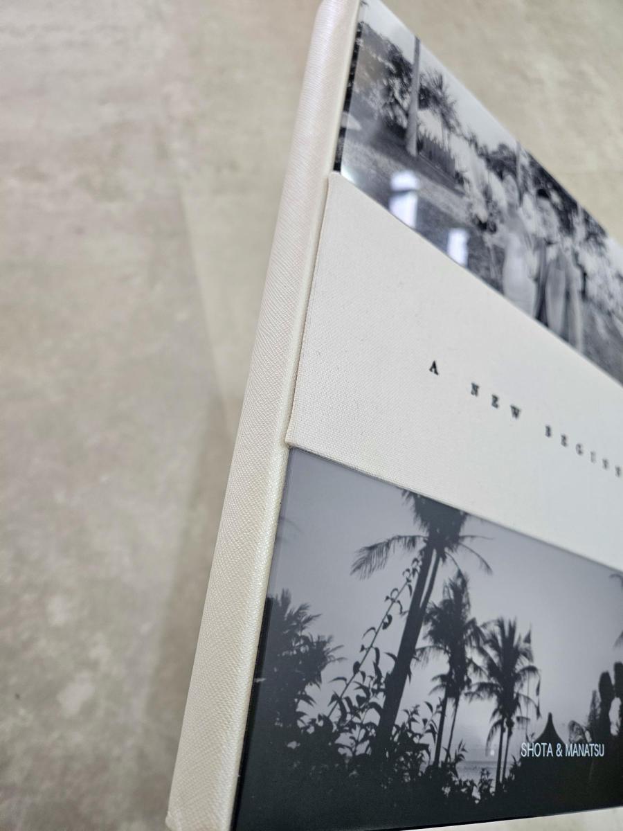 表紙のアクリルは、クリアアクリルとスモークアクリルの 異なる素材を使用しており、1冊で異なる2つの雰囲気を 楽しめるデザインです。 スモークアクリルにはUVプリントでお名前、 中央のリネンには”A NEW BEGINNING”の黒箔加工を施し 重すぎず軽すぎない絶妙なバランスは、 カジュアルさと高級感の両立を実現しています。