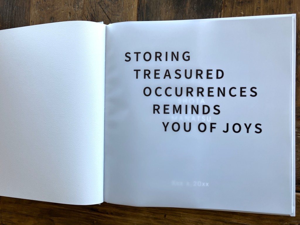 表紙とトレーシングペーパーで完成する「メッセージ」。 トレーシングペーパーを纏う事で 爽やかでで軽やかな雰囲気のアルバムに仕上げています。 中ページはブックタイプで雑誌や写真集のような 手にとりやすい1冊です。
